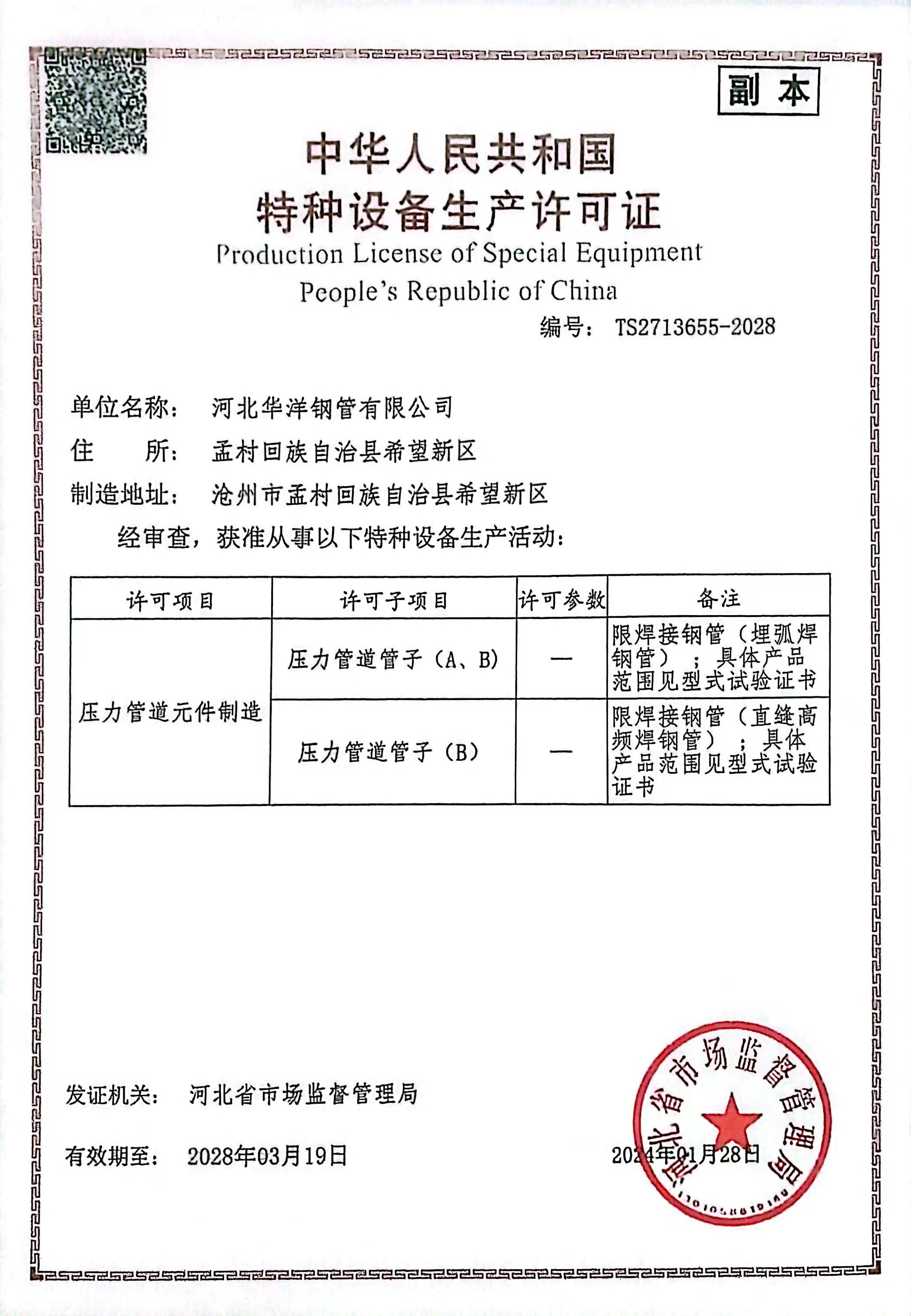 公司產品主要用于石油、天然氣、水、蒸汽、煤氣等高、中、低壓流體輸送管道及打樁、橋梁、建筑等結構用鋼管,并承擔了國內外標志性工程建設,華洋作為一個綜合型生產企業,下設河北銘高貿易有限公司,以及在天津石家莊、山東、四川、廣州等地設立有3家分公司和5個辦事處。產品銷往各個城市井出口東南亞、中東、歐美等八十多個地區,在國內外享有很高的聲譽。